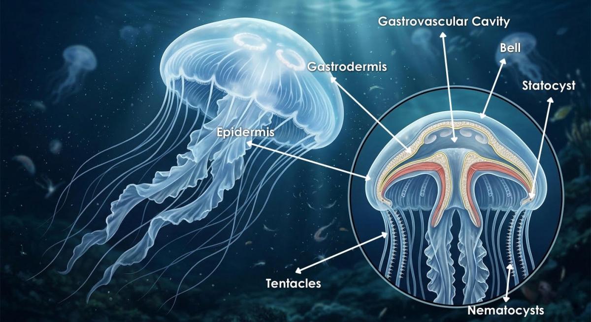 Without lungs or gills, jellyfish use direct diffusion. Because their body wall is extremely thin, consisting of only an outer epidermis and an inner gastrodermis oxygen molecules pass directly from the water into their cells. While humans have thick, waterproof skin and separate internal organs, a jellyfish is two-layered balloon where the outer "skin" (epidermis) acts as its lungs and the inner "lining" (gastrodermis) serves as its entire digestive system. They don't need blood because every cell is close enough to the outside world to "breathe" on its own.